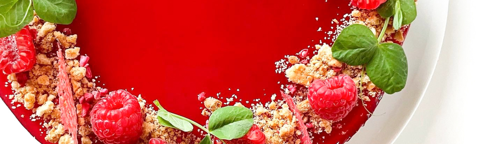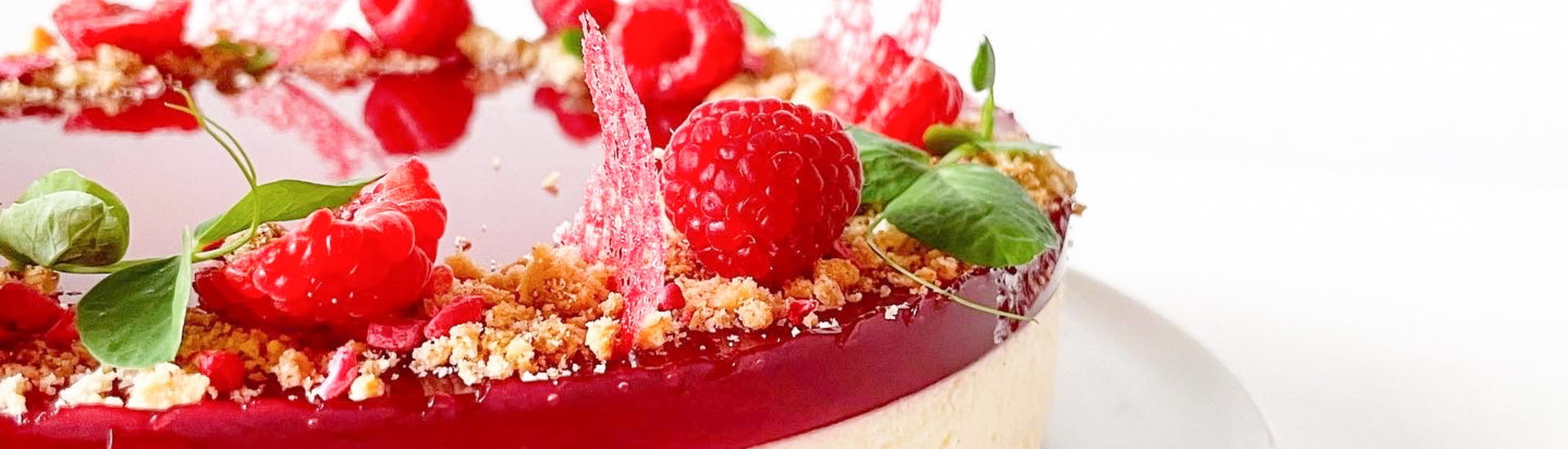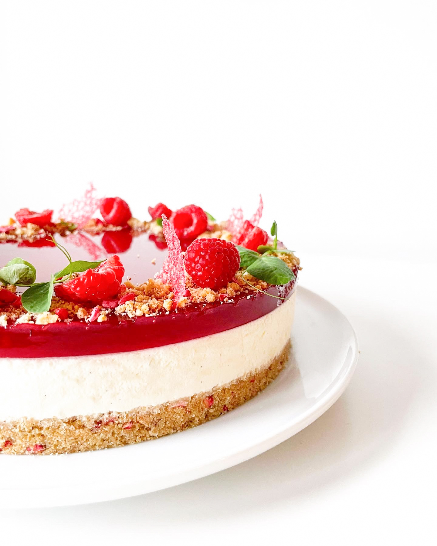 Befri kagen fra kageringen og kageplast. Knus kiksene og bland dem med lidt frysetørret hindbær, fordel det rundt i kanten af kagen. Pynt med friske hindbær, ærteskud og koraller