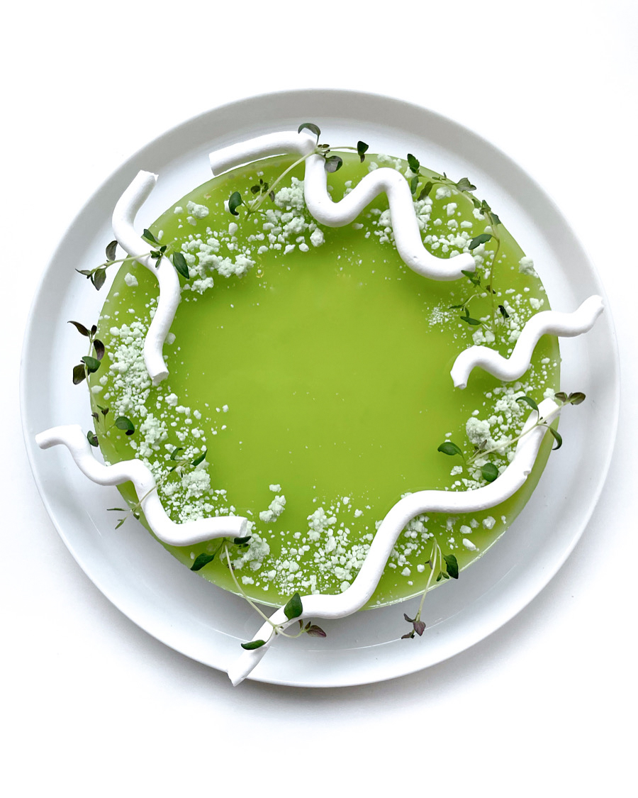 Befri kagen for kageringen og kageplast. Pynt med det krystalliseret chokolade rundt i kanten og marengsgrenen og timianen ovenpå.