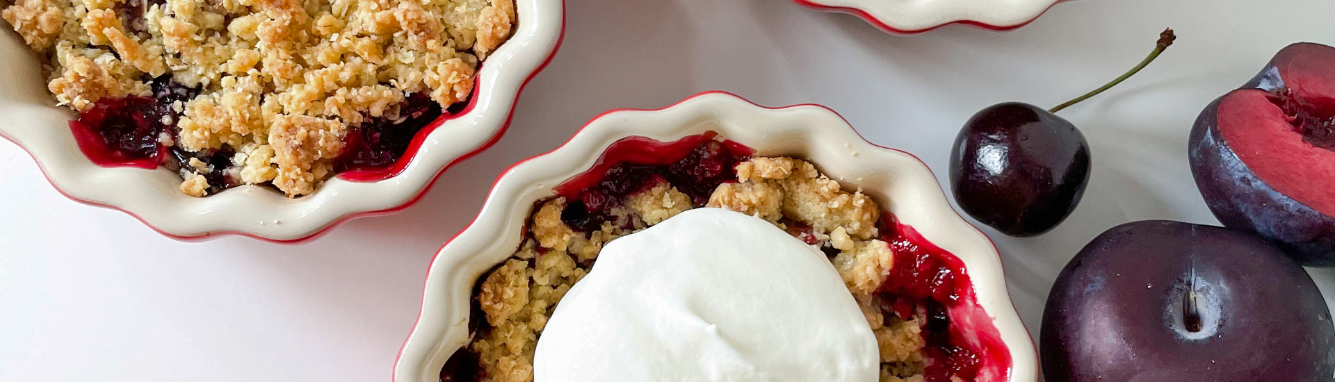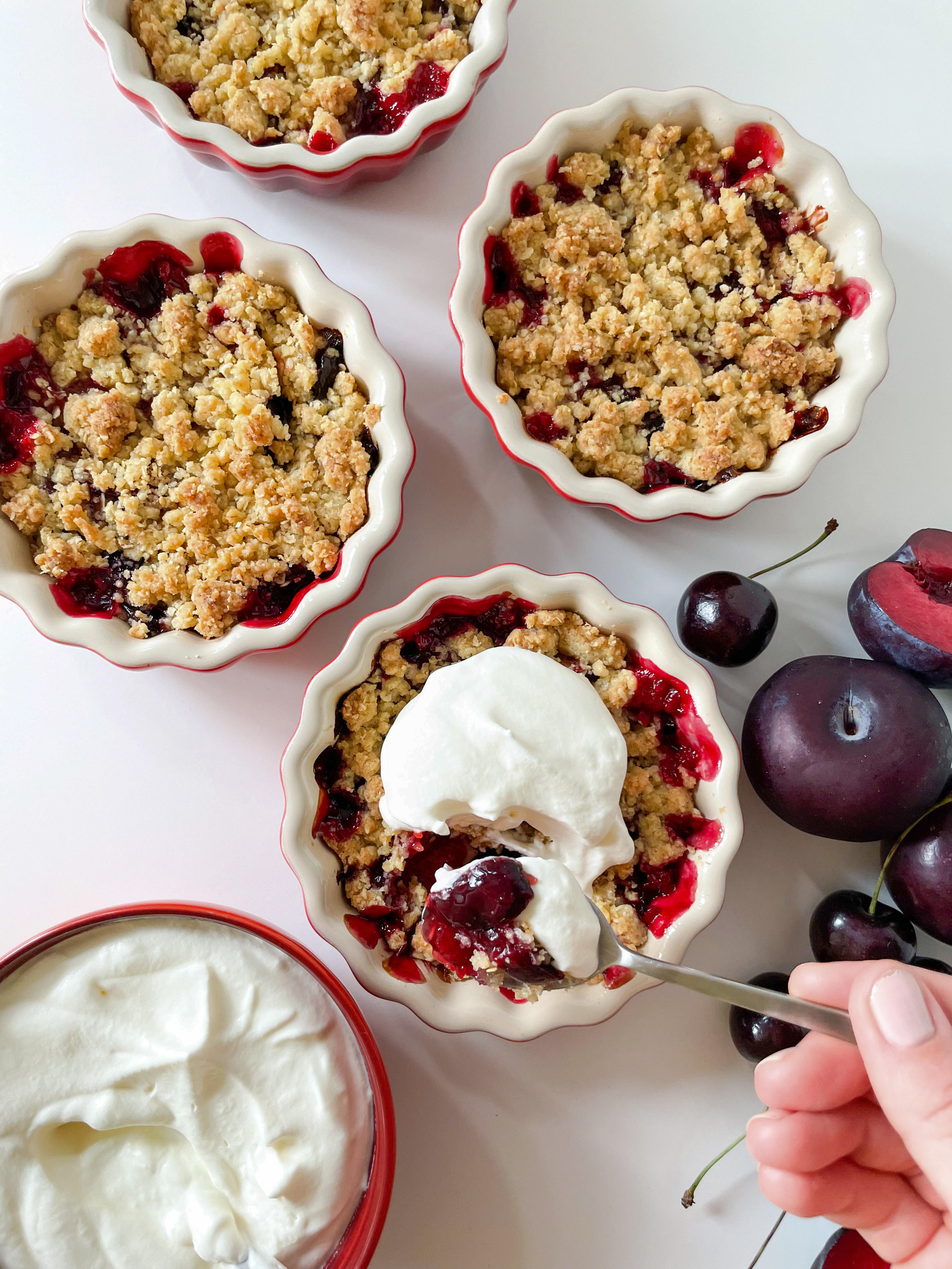 Sommeren er ikke helt forbi og jeg stemmer for, at vi skal holde den lidt i live endnu. Jeg har derfor været i køkkenet og har lavet den nemmeste og lækreste dessert med blommer og kirsebær!