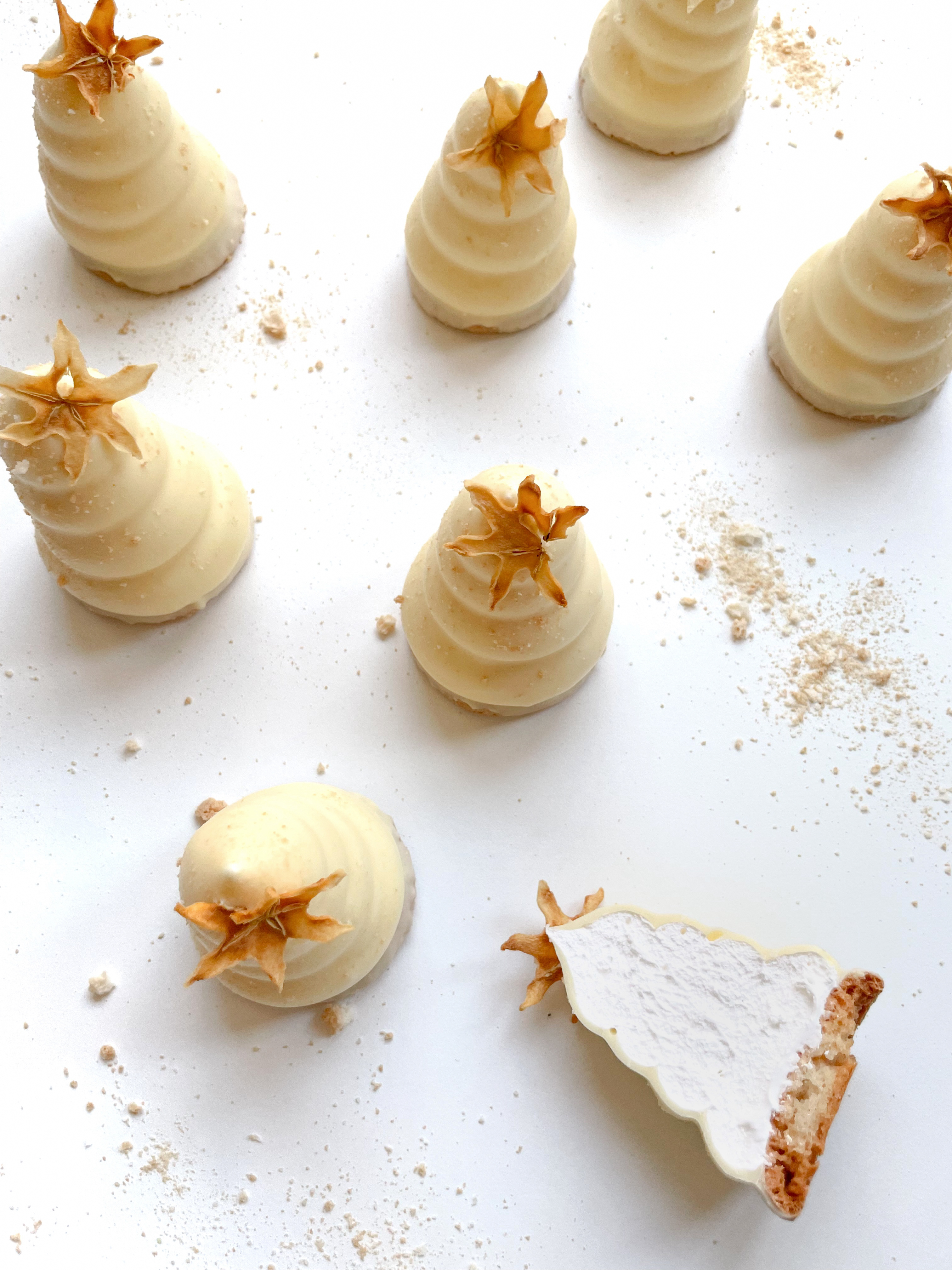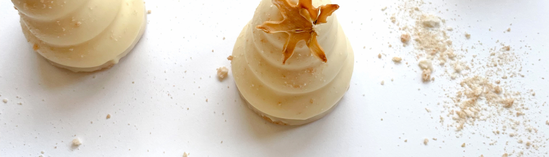 Pisk æggehviderne let og tilsæt herefter de 20 g sukker og pisk videre imens du forsætter med opskriften. Kog sukker, æblesaft, glukosesirup og citronsyre i en gryde op til 118 grader. Siruppen hældes ned i æggehviderne i en tynd stråle mens der forsat piskes. Pisk på den højeste hastighed og pisk i cirka 10-15 minutter, tilføj i mens vaniljepasta. Kom i en sprøjtepose med en glat tyl og sprøjt æbleskummen ud på bundene.