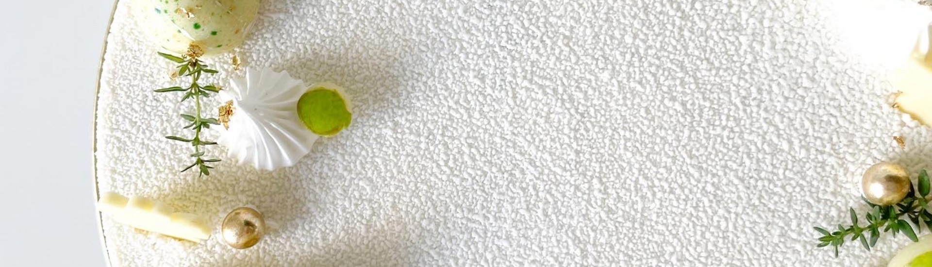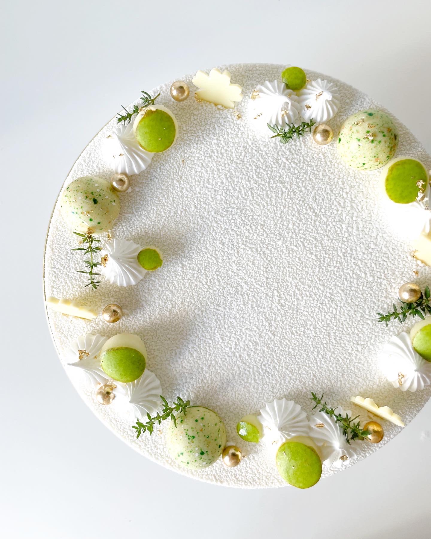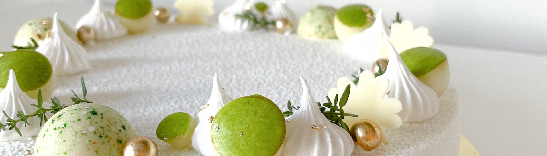 Befri kagen fra silikoneformen og spray den med hvid velvetspray. Lad den tø op og pynt det herefter med marengs dytter, pære stykker som er skåret med et parisiennejern og vendt i limesaft. Udover dette har jeg pyntet med guldkugler, chokoladepynt, frisk timian og guldstøv.