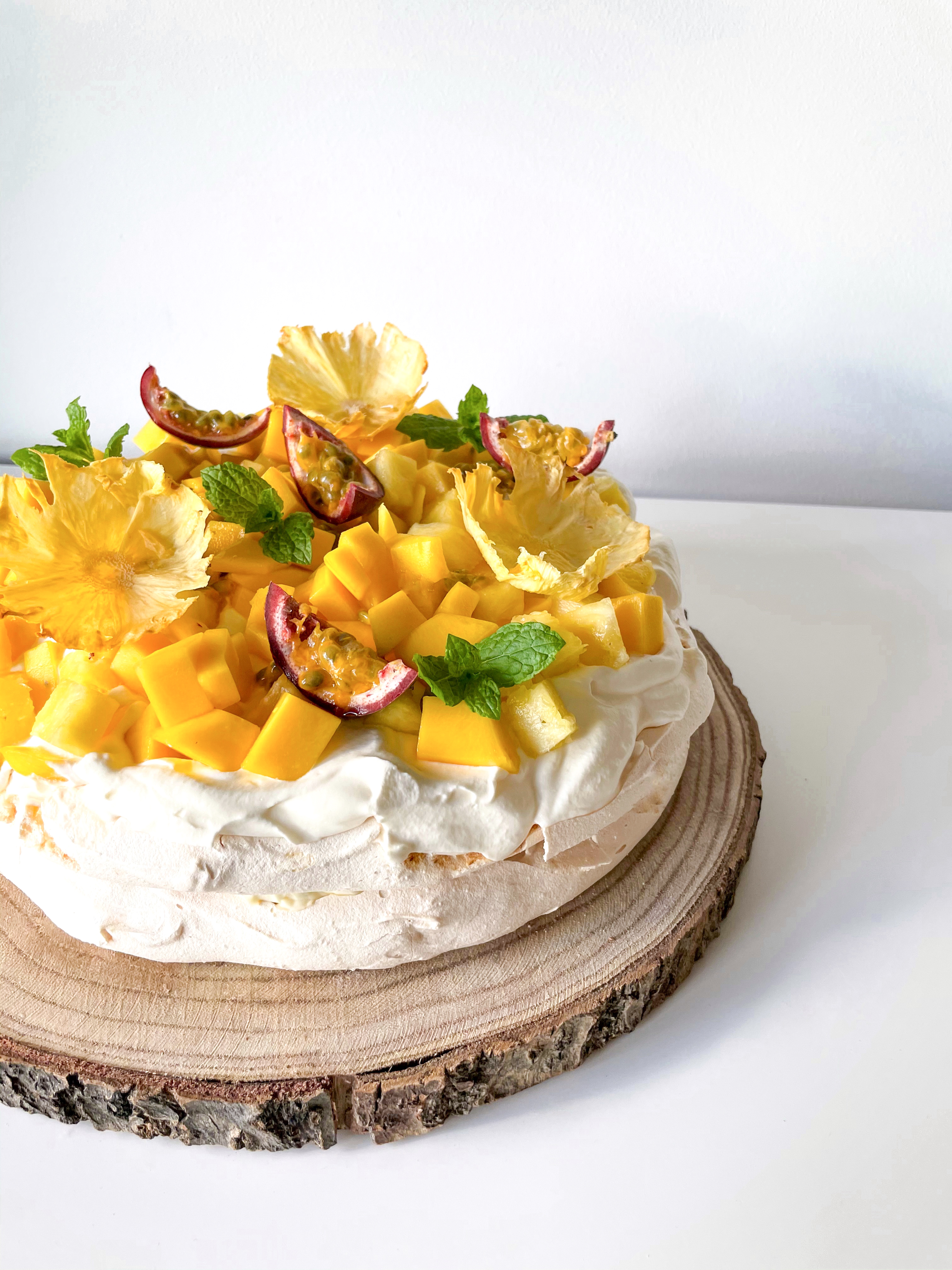 Tag en af marengsbundene og smør limecremen forsigtigt ud på den. Læg herefter 1/3 af ananassen, mangoen og passionsfrugtsaften på cremen.