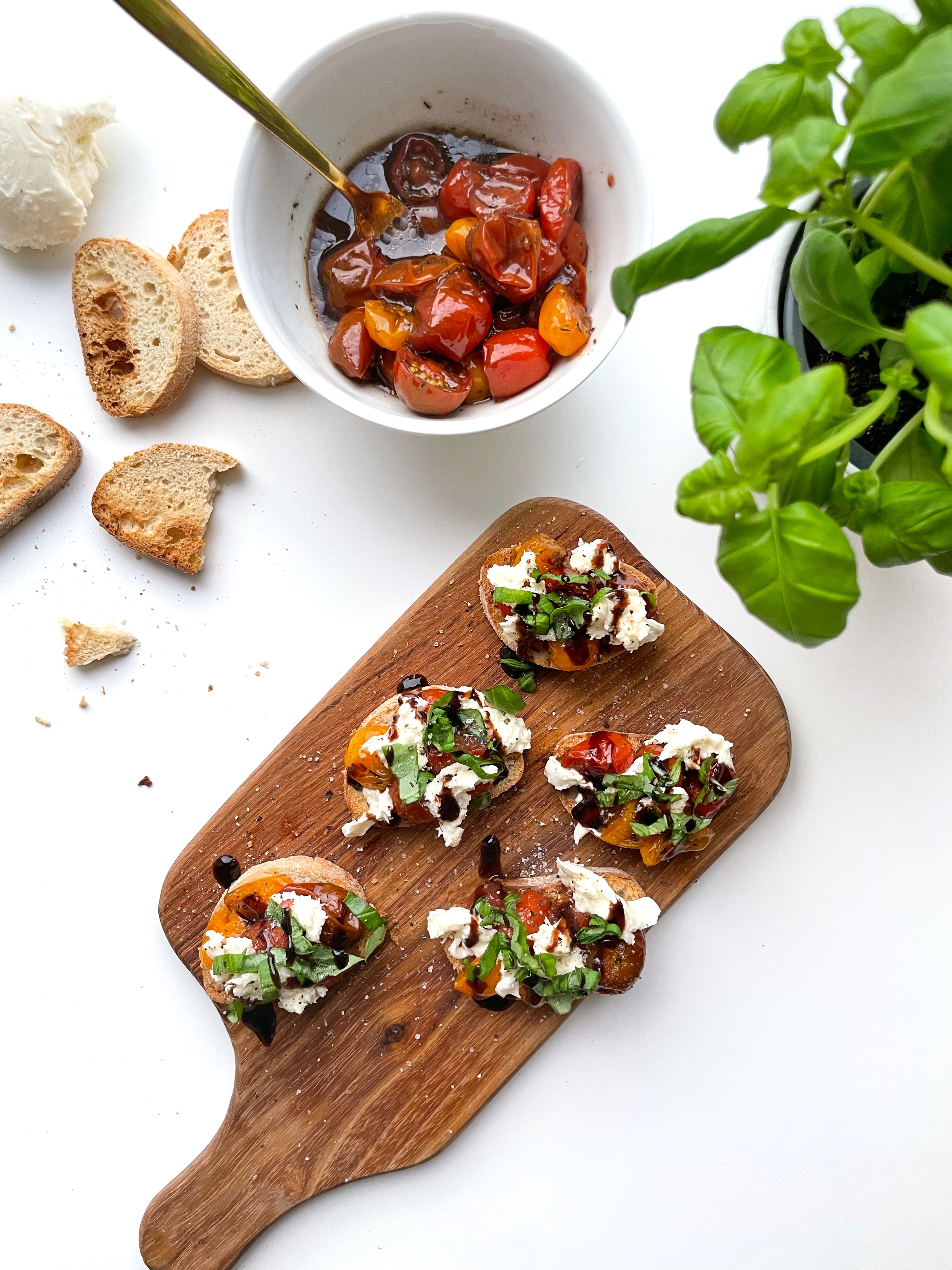 Disse bruschetta slår aldrig fejl og alle de gæster jeg har serveret dem for, er vilde med dem! Og et kæmpe plus tomaterne kan laves klar dagen før – så det er nemt at servere når man har gæster.