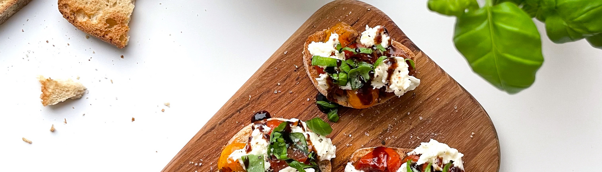 Læg tomaterne på brødet sammen med mozzarellaen. Pynt med frisk basilikum og balsamico glaze.
