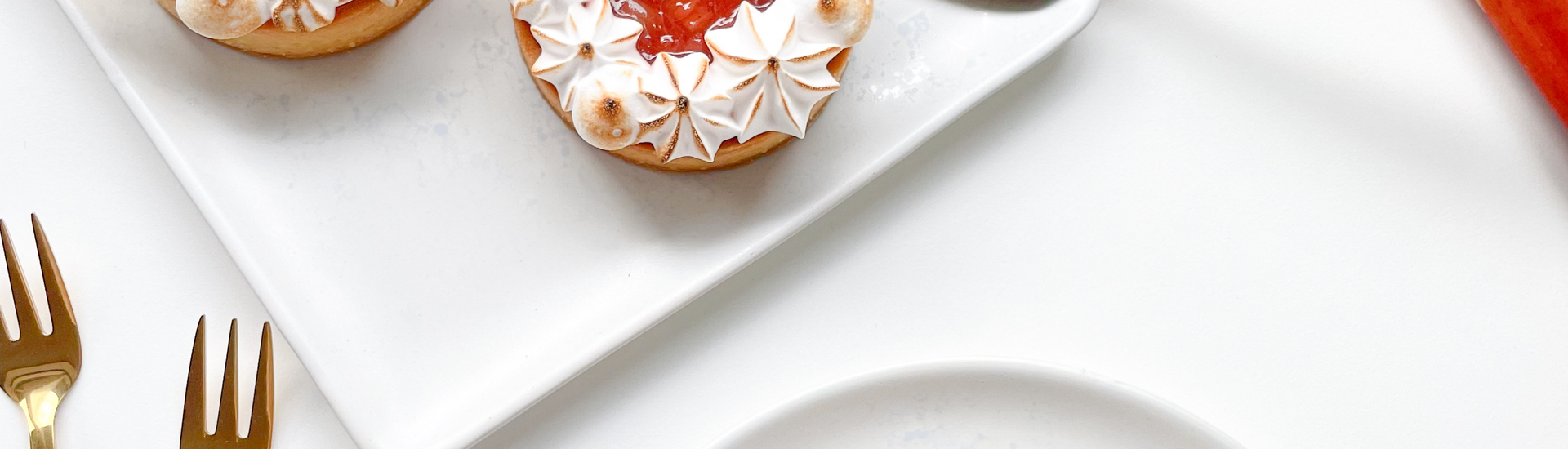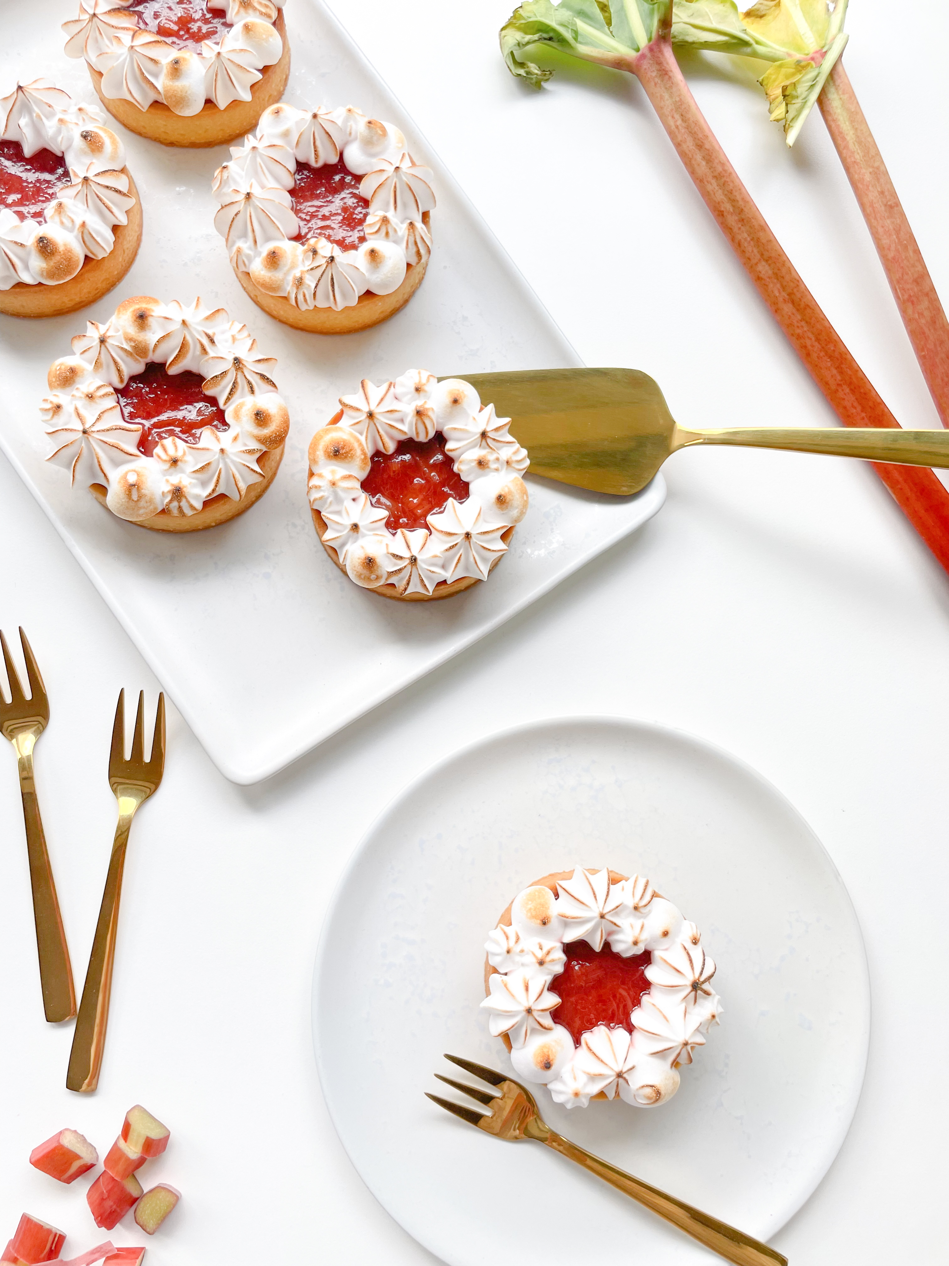 Disse små portionsanrettede tærter består af en sprød mørdej, syrlig rabarberkompot og en marengs som gør tærterne dekorative.